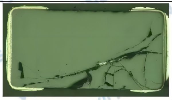 - 外界机械应力可能导致电容受挤压破裂,从而导致潜在的漏电失效。此时的裂缝一般呈斜线,从端子与陶瓷体的结合处开裂。