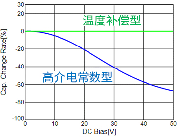 温度补偿型(COG/U2J特性等)主要使用锆酸钙类材料,具有C0G的温度特性,也就是温度引起的容量变化较小。这种类型的电容器在直流偏压、老化特性和静电容量方面表现不佳,但可以用于振荡、调谐(滤波)、耦合、匹配等电路中。