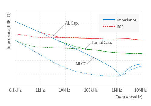 对于MLCC而言,其ESR值通常较低,这也是其被广泛应用于高频电路的一个重要原因。特别是在大容量(1μF以上)的情况下,MLCC的ESR值通常只有数?到数十?,远低于铝电解电容器(AL Cap.)或钽电解电容器(Tantal Cap.)。这使得MLCC在大容量、高频应用场合中具有显著的优势。