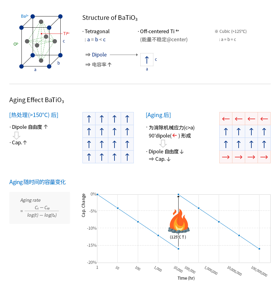 偶极子的形成对MLCC的容量有着重要的影响。随着时间的推移,MLCC内电介质的偶极子的自由度会逐渐降低。这意味着,即使我们为了测量容量而给MLCC加上AC电压,这些偶极子也逐渐不再做出反应。最终,这就导致了MLCC的容量逐渐减少。
