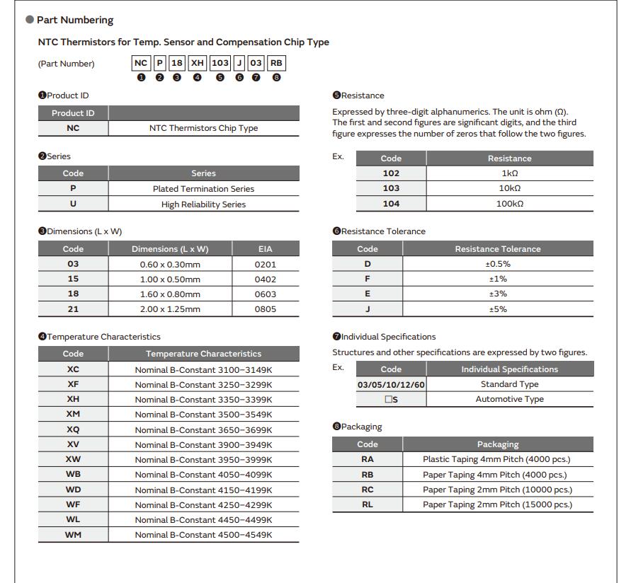 村田muRata热敏电阻的零件编号通常由多个部分组成,这些部分提供了关于元件尺寸、性能、封装和特定规格的信息。以下是一个典型的零件编号示例及其组成部分的解析: